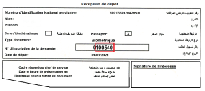 Pour vérifier la disponibilité de votre passeport biométrique, veuillez introduire le numéro d’inscription de la demande (les six (06) derniers chiffres) qui figure sur le récépissé de dépôt (voir image ci-dessous).